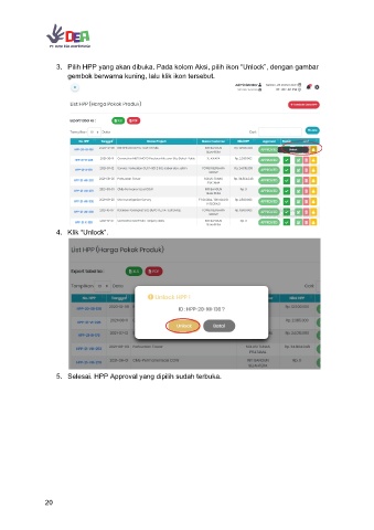 3. Pilih HPP yang akan dibuka. Pada kolom Aksi, pilih ikon “Unlock”, dengan gambar gembok berwarna kuning, lalu klik ikon tersebut. 4. Klik “Unlock”. 5. Selesai. HPP Approval yang dipilih sudah terbuka. 20