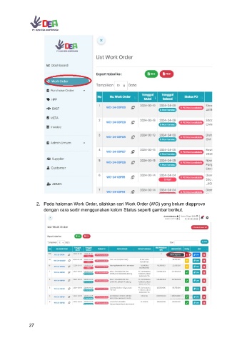 2. Pada halaman Work Order, silahkan cari Work Order (WO) yang belum diapprove dengan cara sortir menggunakan kolom Status seperti gambar berikut. 27