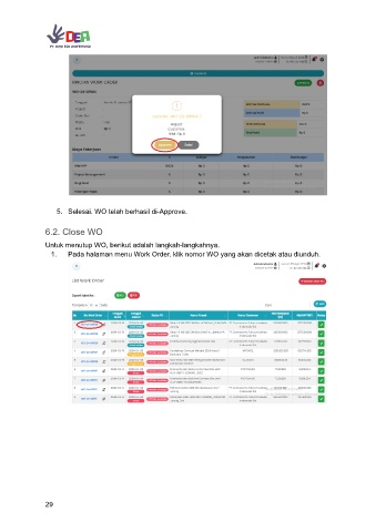 5. Selesai. WO telah berhasil di-Approve. 6.2. Close WO Untuk menutup WO, berikut adalah langkah-langkahnya. 1. Pada halaman menu Work Order, klik nomor WO yang akan dicetak atau diunduh. 29