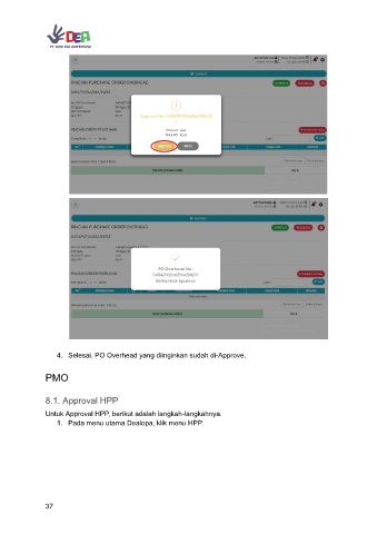 4. Selesai. PO Overhead yang diinginkan sudah di-Approve. PMO 8.1. Approval HPP Untuk Approval HPP, berikut adalah langkah-langkahnya. 1. Pada menu utama Dealopa, klik menu HPP. 37