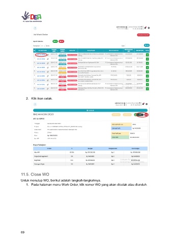 2. Klik ikon cetak. 11.5. Close WO Untuk menutup WO, berikut adalah langkah-langkahnya. 1. Pada halaman menu Work Order, klik nomor WO yang akan dicetak atau diunduh. 69