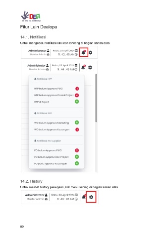 Fitur Lain Dealopa 14.1. Notifikasi Untuk mengecek notifikasi klik icon lonceng di bagian kanan atas. 14.2. History Untuk melihat history pekerjaan, klik menu setting di bagian kanan atas. 80